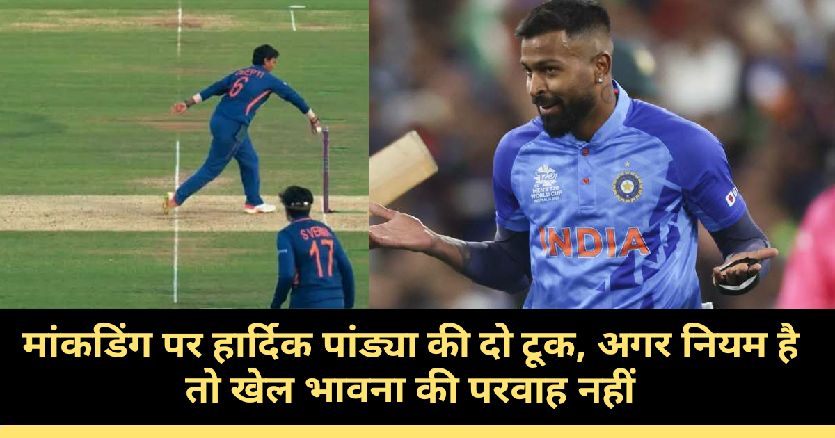मांकडिंग का विषय लगातार विवादो में रहता है। क्रिकेट पंडित नॉन स्ट्राइकर बल्लेबाज को गेंदबाज द्वारा मांकड़ करने पर खेल भावना की दुहाई देने लगते हैं आखिर जब कोई नियम रूल बुक का हिस्सा है तो उसमे खेल भावना को आहत पहुंचाने का सवाल कहा से पैदा होता है? इसी मुद्दे पर भारतीय टीम के हरफनमौला खिलाड़ी हार्दिक पांड्या ने खुले मिजाज से बात चीत की और जवाब देते हुए सबको चौंका दिया साथ ही दीप्ति शर्मा पर उंगली उठाने वालों की उंगली तोड़ भी दी।